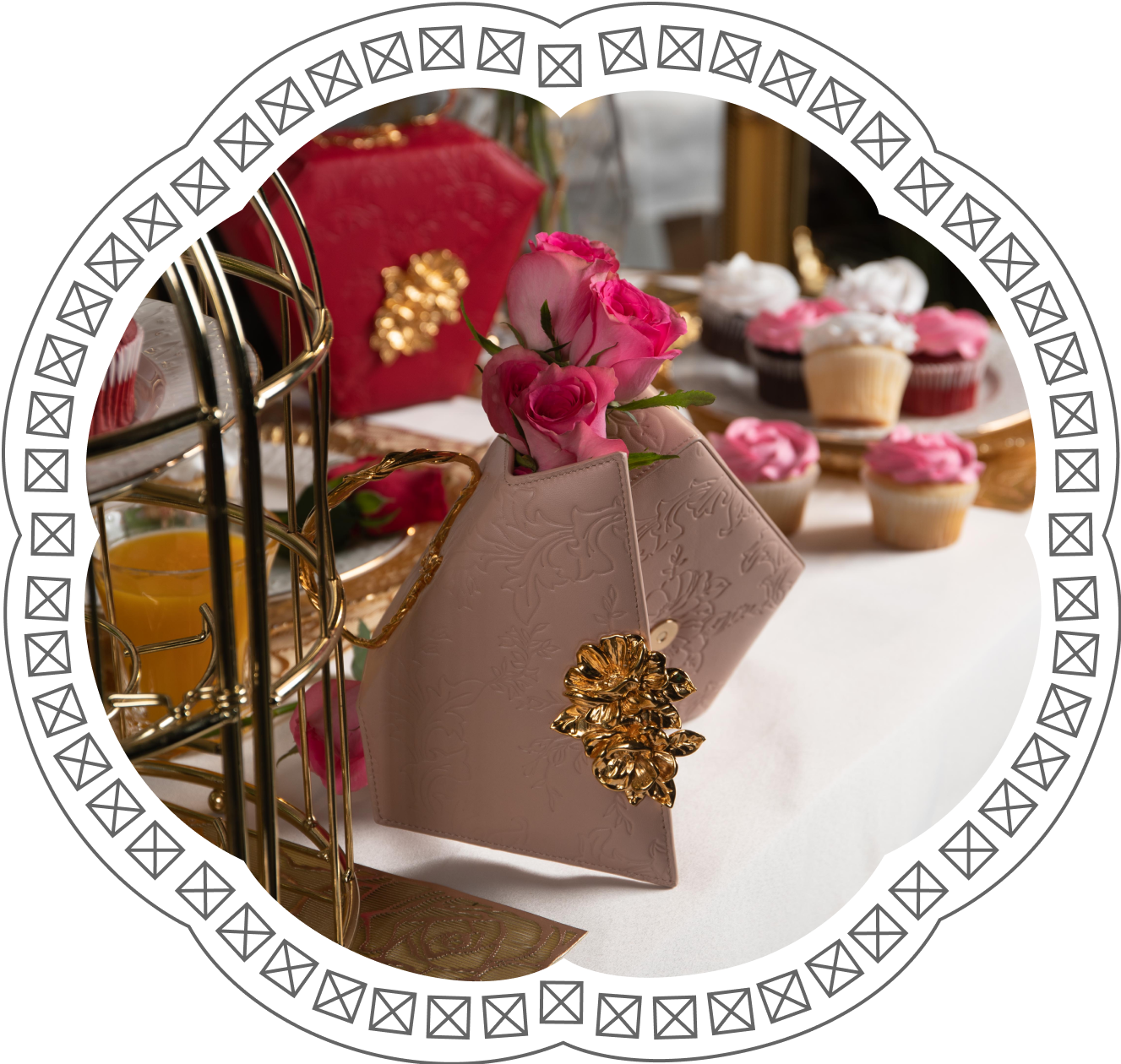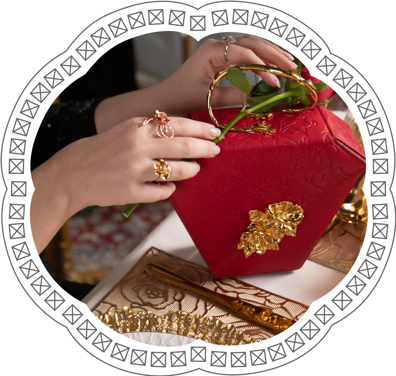 Implemented (and executed) as a 3D drawing, our Luxury Diamond Flower Clutch seamlessly blends in a pattern of beautifully carved Tulips (leaves and branches) in order to envelop and contain the diamond shape as a whole.
